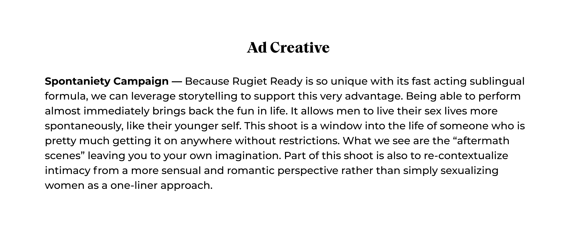 Rugiet Health is a digital health clinic that specializes in customized treatments prescribed by board-certified doctors on a secure, user-friendly patient platform. Headquartered in Austin, TX with multiple nation-wide compounding pharmacies. Rugiet Health invented a compounded pharmaceutical treatment that contained personalized ratios depending on the patient’s needs. Aging with dignity and distigmatizing conversations around E.D. was the main lifestyle approach with this brand while utilizing the benefits of sublingual delivery which made the onset 5X faster than anything on the market at the time.